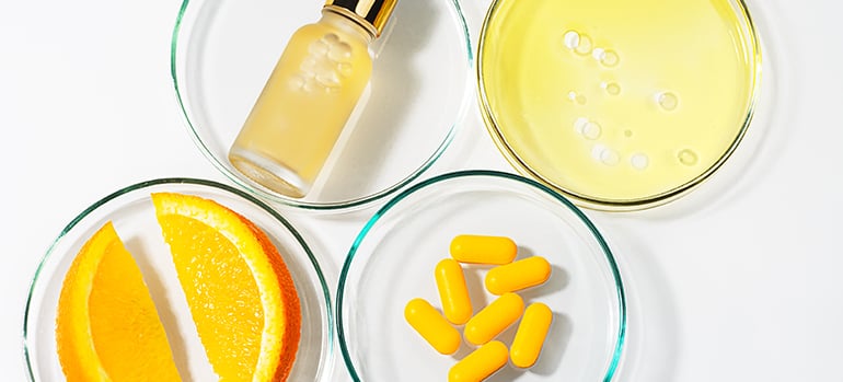 A lab scene with test tubes and a glass vial, representing biotechnology's role in enhancing quality in beauty products